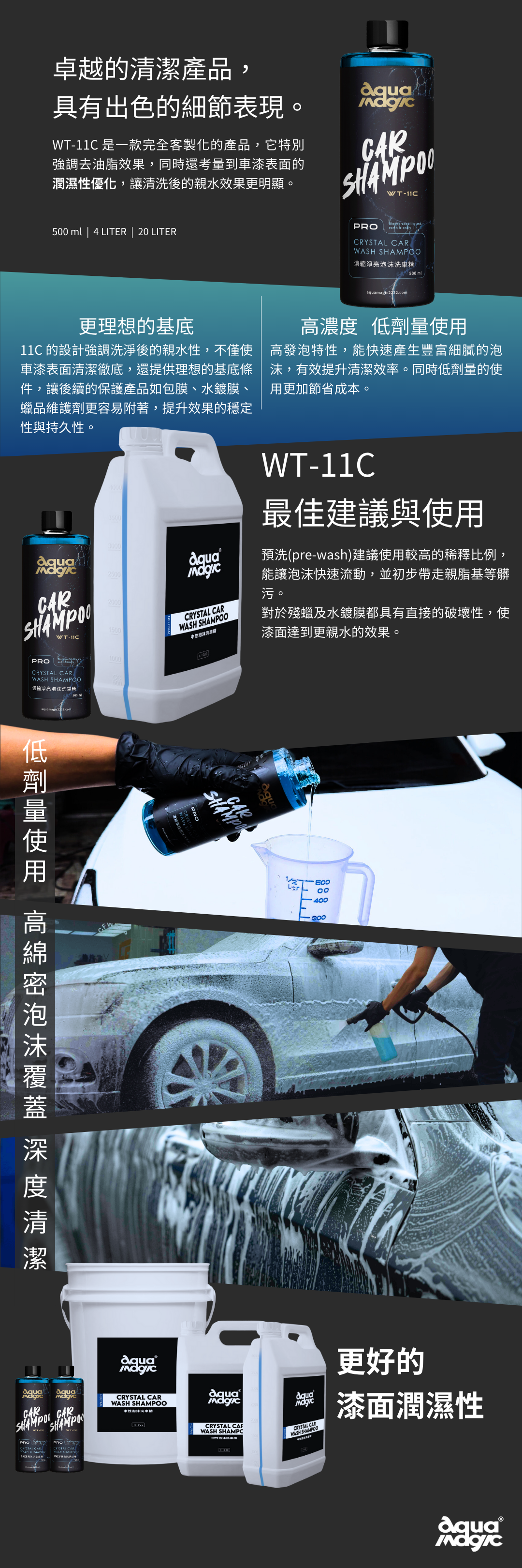 請以清水沖洗車體身上的油污、粉塵等髒污,待車體表面非處於高溫狀態下,將本品稀釋於清水中,利用高壓或乾淨海綿噴灑塗抹於車體上,再行以乾淨海綿擦拭車體進行清潔,嚴重髒污處請反覆擦拭多次。輪框及車體建議以不同海綿清洗,以避免輪胎髒污粉塵刮傷車體,待清潔完畢後,以清水沖去剩餘泡沫即可。