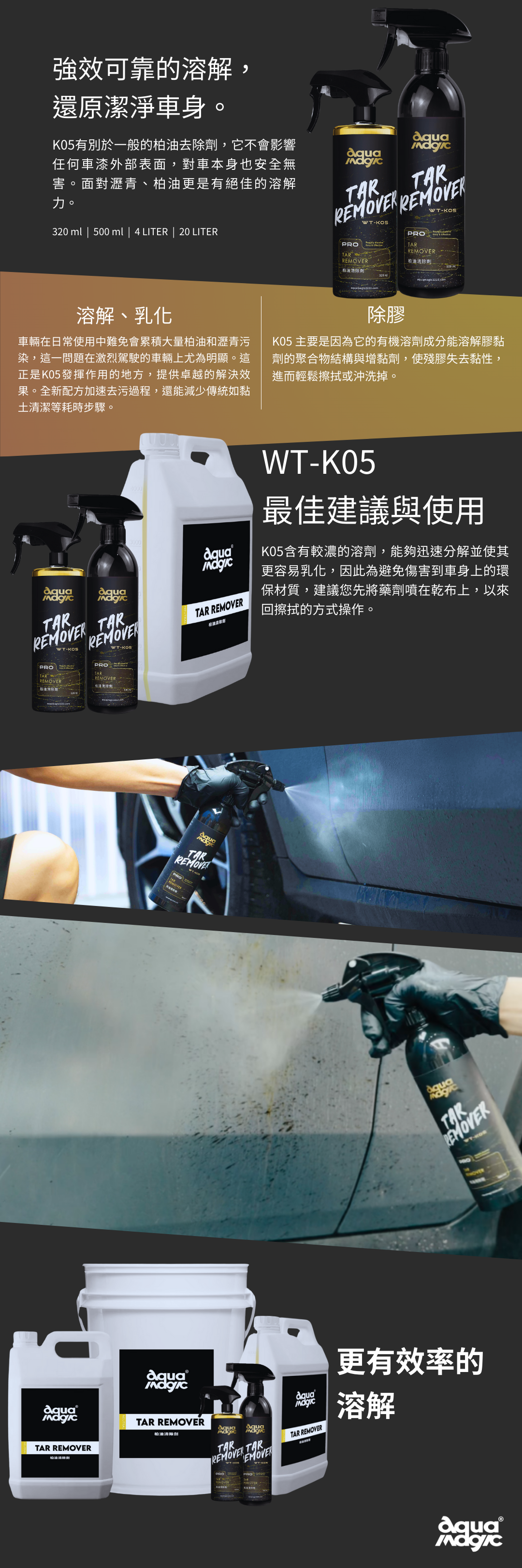 在車體冷卻的時將本產品噴灑於柏油、瀝青等髒汙附著位置,30秒後待髒汙溶解後,以強力水柱清洗乾淨即可。